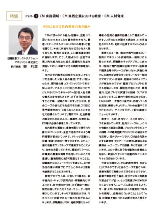 一般社団法人日本コンストラクション・マネジメント協会(日本CM協会)機関誌「CMAJ」2022年度秋号(69号)の特集「CM×教育(第3回) Part-Ⅰ日本における CM 教育の現状(その2)」に、当社執行役員 東 利彦の寄稿記事「当社における社内教育の取り組み」が掲載されました。