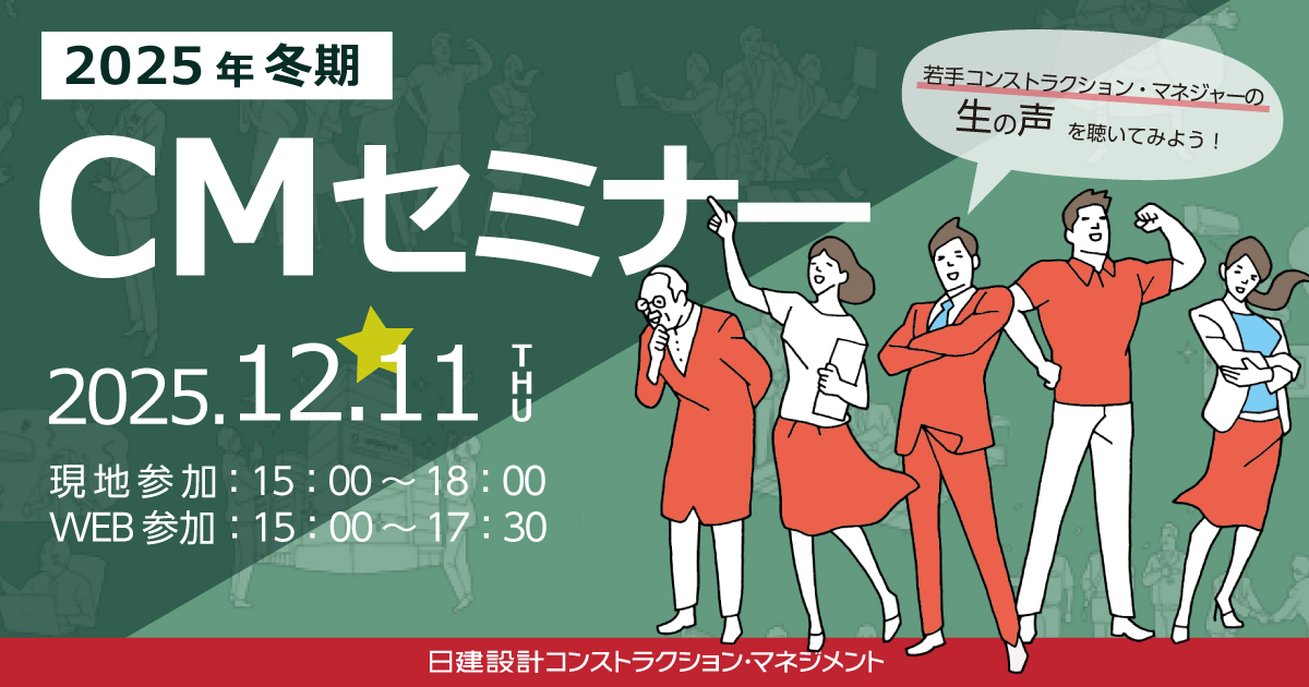 コンストラクション・マネジメントは、建設プロジェクトを成功に導く事業主のパートナーとして、建設業界内外で注目を集め、年々需要は拡大しています。建設業界の中でも特に新しく、とても魅力的なコンストラクション・マネジメントという仕事を、是非学生の皆さんに知ってほしい!そこで、今回のセミナーでは、当社に新卒で入社した金の卵の若手コンストラクション・マネジャーが登壇し、どんなことをしているのかを発表します。また、そんな彼らに何でも聞き、意見交換できるQ&Aも開催します。大学生・大学院生であれば、学年や専攻は問いません。建設業界に興味がある方、将来のキャリアにコンストラクション・マネジメントを考えている方、新しい知識を得たいと思っている方など、幅広い学生の皆さんにご参加いただきたいと思います。セミナーはWEBでも中継しますので、現地に来られない方もお気軽にご参加いただけます。現地では、若手コンストラクション・マネジャー、更には来年当社に入社予定の仲間もいますので、彼らと交流を深め、情報交換するチャンスです。皆さんのご参加お待ちしております!