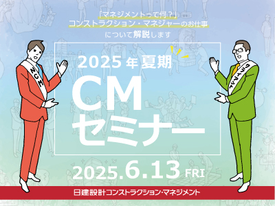 近年、コンストラクション・マネジメント(CM)の重要性が認識され、建設業界内外でその知名度が高まっています。しかし、まだ学生の皆さんにとってはあまり馴染みのない分野かもしれません。そこで私たちは、次世代を担う皆さんにCMの重要性と魅力を伝えるためにセミナーを開催いたします。このセミナーは、大学生や大学院生を対象としており、学年や専攻は問いません。建設業界に興味がある方、将来のキャリアにCMを考えている方、または新しい知識を得たいと思っている方など、幅広い学生の皆さんに参加していただきたいと思います。このセミナーはWEB開催のため、場所を選ばずどなたでも気軽に参加することができます。ぜひ、この機会を活用してCMの世界に飛び込んでみてください。ご参加お待ちしております。開催概要■日程2025年6月13日(金)16:30~18:00(16:15 WEB開場)■開催方法オンライン開催(Zoomウェビナー)■内容WEB開場 16:15~16:30オリエンテーション・代表挨拶 16:30~16:40セミナー 16:40~17:40質疑応答・おわりに 17:40~18:00申込み① 禁止事項の確認本セミナーでは、当社で実際に行ったプロジェクトについて、いくつかご紹介いたします。当日ご紹介するプロジェクトには当社業務での機密事項が多く含まれます。本セミナーに参加いただく為には、秘密保持のための下記の禁止事項を事前にご確認の上、ご承諾をいただきます。エントリーフォーム内で必ずご回答ください。この度、貴社にて開催される「2025年夏期 CМセミナー」(以下、本イベントという。)の参加にあたり、以下の事項を遵守いたします。(秘密保持のための禁止事項) 以下の項目を遵守いたします。本イベントにおける一切の写真撮影(Screenshot等)、録画、録音の禁止。本イベントにて得た情報の公開と第三者への漏洩の禁止。本イベントにて使用した資料についてのコピー、引用、配布、公開の禁止。本イベントにて得た情報について、LINE、X、Instagram、FaceBook等のSNSその他の方法による、インターネット上への書き込みや画像等の掲載に禁止。本イベントで使用するミーティングURL・ミーティングID・パスコード等について、第三者への共有の禁止。