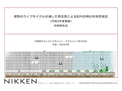 2020年11月18日(水)に開催された、国土交通省の第6回建築BIM環境整備部会にて、当社新規領域開拓チーム 主宰 吉本 圭二が「建物のライフサイクルを通した発注者によるBIM活用の有効性検証」について報告しました。当社発表資料は下記ホームページをご参照ください。【国土交通省ホームページ】第6回建築BIM環境整備部会(令和2年11月18日開催)資料3-5:日建設計コンストラクション・マネジメント株式会社 説明資料https://www.mlit.go.jp/jutakukentiku/build/jutakukentiku_house_fr_000112.html