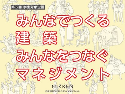 建築に興味をお持ちの学生の皆さんに向けて、コンストラクション・マネジメント(CM)への理解を深めていただくために、学生対象企画『みんなでつくる建築 みんなをつなぐマネジメント』を開催します。学生の皆さんに、CM(コンストラクション・マネジメント)とはどのような仕事かを知っていただくとともに、その魅力や可能性を、感じていただきたいと思います。大学生・大学院生でしたら学年は問いません。奮ってご参加ください。■日程2020年12月11日(金) ←申し込み受付は締め切りました。※開催時間は、16時より2時間程度を予定しています。■内容第1部:「CMって何?」(業界の成り立ちとCM)第2部:「コンストラクション・マネジャーの働き方を見てみよう!」(座談会)■開催方法オンライン開催(Zoom 予定)※詳細は、ご参加のお申込みが完了された方へメールにてご連絡します。■申込み申し込み受付は締め切りました。下記必要事項を記載の上、メールにてお申込みください。<必要事項>①氏名②学校名/学部学科研究室③学年④連絡先(携帯電話番号ならびにメールアドレス)1通のメールで、複数名分お申込みいただいても差し支えありません。その場合は必ず、参加を希望される方全員の必要事項をメールに記載してください。<申込み先>ncmsomu@nikken.jp(総務担当)申込締切:2020年12月4日(金)■資料ダウンロード<資料ダウンロードはこちら>第6回 学生対象企画『みんなでつくる建築 みんなをつなぐマネジメント』(PDFダウンロード)日建設計コンストラクション・マネジメントは、CMが広く普及・浸透することを目指して今後も学生対象企画を開催して参ります。