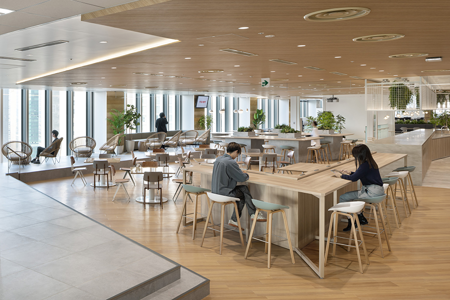 同社の業績の上昇に合わせるように、従業員数も増加していく中で、快適なオフィス空間の整備を図ることはもとより、従業員同士の活発なコミュニケーションを誘発するワークプレイスの創出を目指しました。