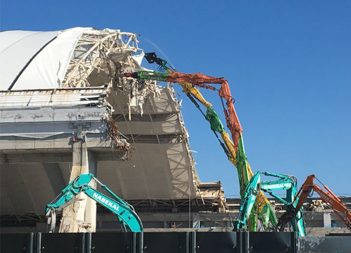ギネス認定の解体重機であるSK3500解体機を導入し、無足場工法でのドーム屋根の解体計画策定を支援。無事故かつ予定工期よりも早く屋根解体を完了に導きました。