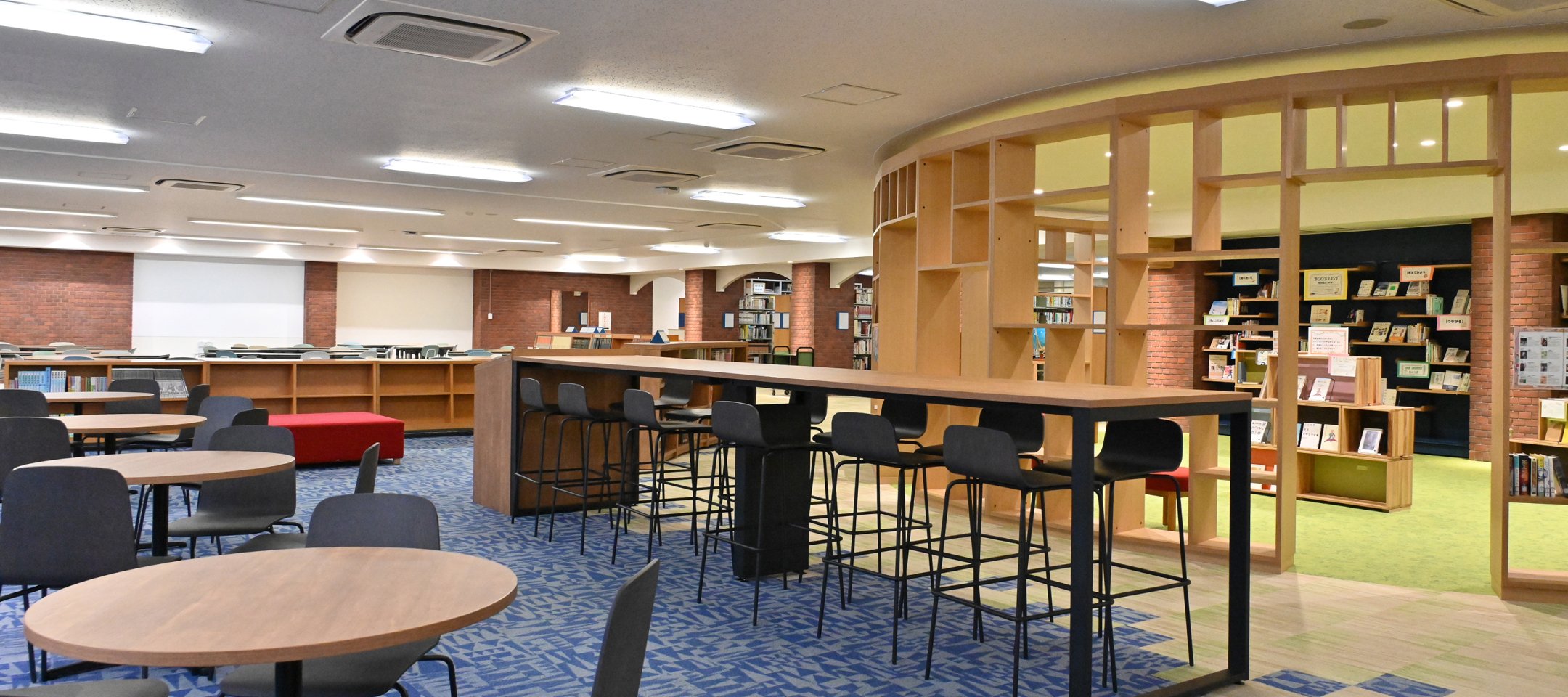 改修にあたってのコンセプトはNCM提案の「本の森を創る」をとし、本に囲まれる書架スペースを中心に設えました。授業におけるグループ学習やプレゼンテーションの場を新設し、従来の図書館の形式に捉われない様々な「居場所」の創設を図りました。また図書館中央部分に配置され、施設のシンボルとなる家具も、NCMより提案したデザインとなりました。