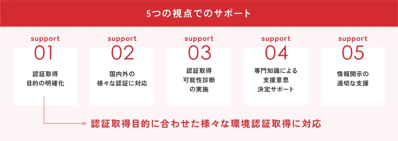 取得可能性診断(フィジビリティスタディ)の結果を踏まえて選定した環境認証システムについて、取得プロセス全体を支援します。環境認証システムに精通した専門コンサルタントが、関係者へのヒアリングから認証取得に向けた書類準備、取得費用の把握と費用対効果までの検証を丁寧に行い、伴走型で最適な認証取得を支援します。