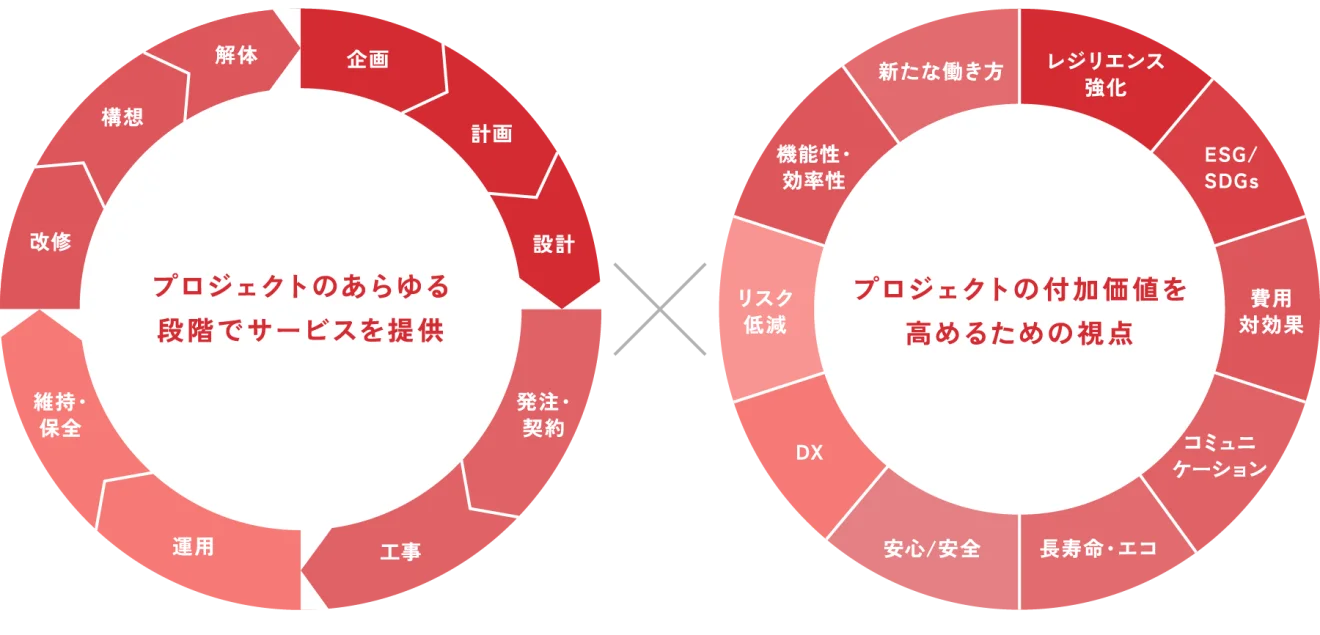 設備に対して、AIを用いたスマートビル化や環境性能向上等、ますます投資が増えると予測される時代を迎えようとしています。その一方で、物価上昇による建設費高騰や、労務人材不足による工事の中止等、建設を取り巻くリスクは年々増大しています。コスト・マネジメントや発注マネジメントの工夫だけでは、対応しきれない場面も生じています。