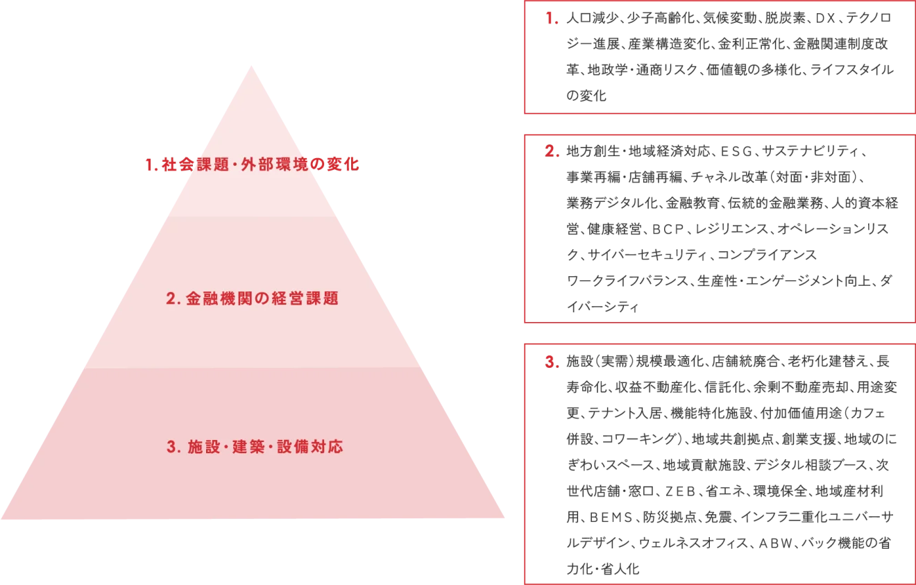 金融機関(関連施設)は、企業の経営基盤を支える役割だけでなく、地域に開かれた社会的インフラとしての信頼性に加えて、災害時の事業継続性、持続可能性、環境対応、地域貢献等、多面的な社会的役割を担ってきました。また、メガバンク、地方銀行、信用金庫、証券会社、生保・損保会社等の金融機関は、近年それぞれ異なる課題に直面し、金融が担う社会的役割の更なる変化に対応した新たな金融機関の在り方へのシフトチェンジが求められています。