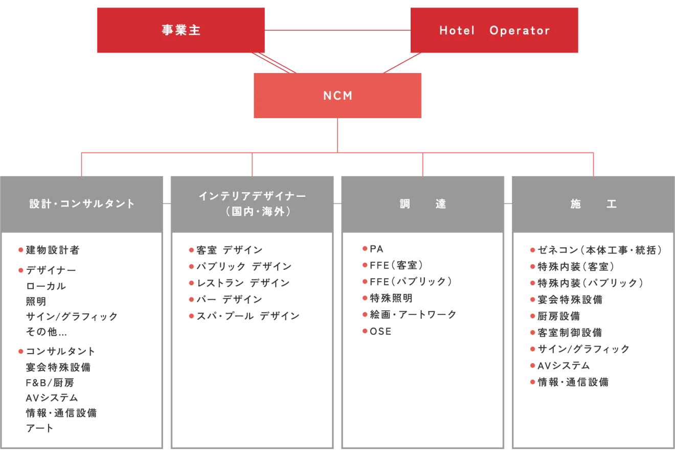 NCMでは、多くの業務経験から、設計・施⼯の合理化とブランド要件の実現の両⽴を図り、ワンストップマネジメントすることで、開業後のホテル運営の成功に⼤きく寄与します。