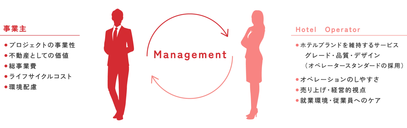 ホテルの契約形態には、直営・リース・フランチャイズ・運営受託等があり、施設側(事業主)と運営側(オペレーター)の要望が異なる場合があります。