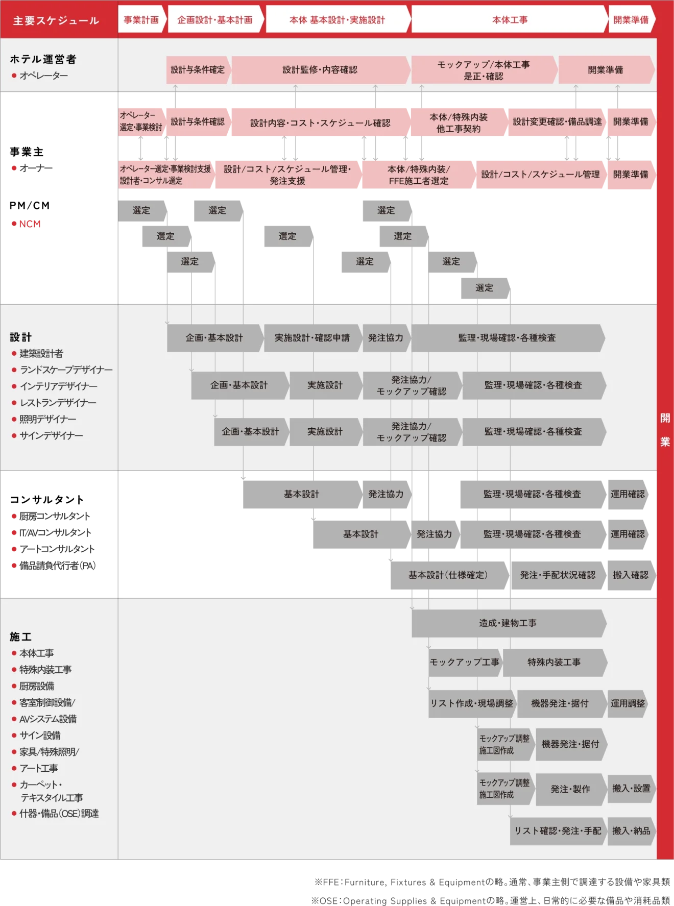 ホテルは、建物本体⼯事完了からFF&E搬⼊設置、準備期間をへて、開業することが⼀般的であり、他⽤途に⽐べ開業までの期間が⻑くなる傾向があります。プロジェクト初期段階から適切なゴールを設定し、関係者の段階的な登⽤、調整、連携を戦略的に⼿戻りなく実⾏することがポイントです。
