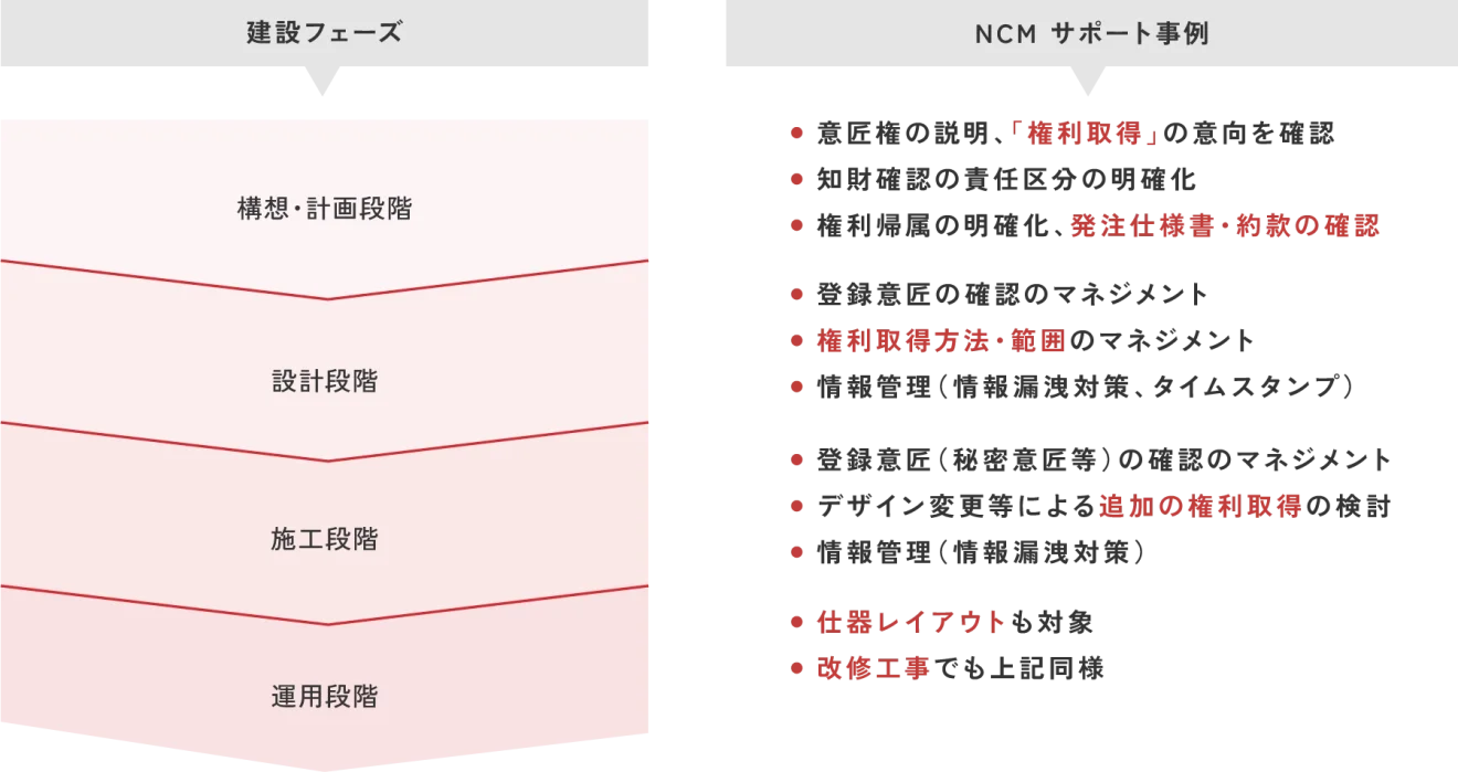 建築デザインの創造性を企業の競争優位につなげるためには、知的財産の戦略的な活用が不可欠です。私たち日建設計コンストラクション・マネジメント(NCM)では、建築デザインに関わる意匠権・商標権を軸としたESG経営と整合した知財戦略コンサルティングサービスを提供します。