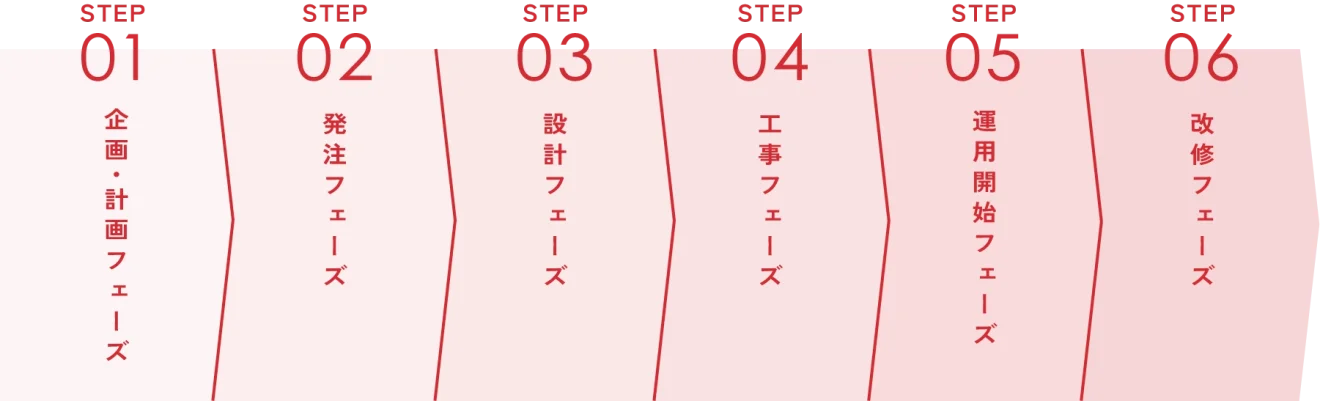 構想・計画段階から設計、発注、施工、運用立ち上げ、そして改修まで。プロジェクトのフェーズに応じた的確な分析と助言によって、最初から最後まで発注者を支え続けます。