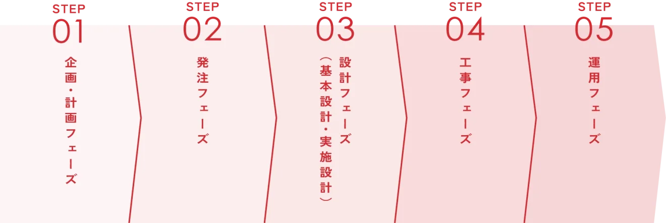 NCMは、建物だけではなく「ものづくりの全体最適」を実現するために、各フェーズで発注者に寄りそった⽀援を⾏います。