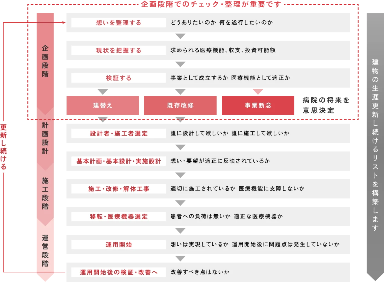 建替えありきの検討ではなく、病院・組織の将来像を描く姿勢で、企画段階から運営段階まで幅広く支援します。