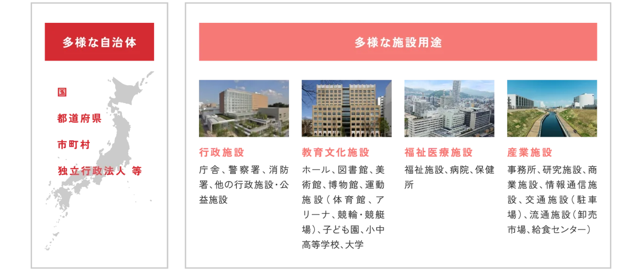 多様な⾃治体と多様な施設⽤途の豊富な実績でサポート