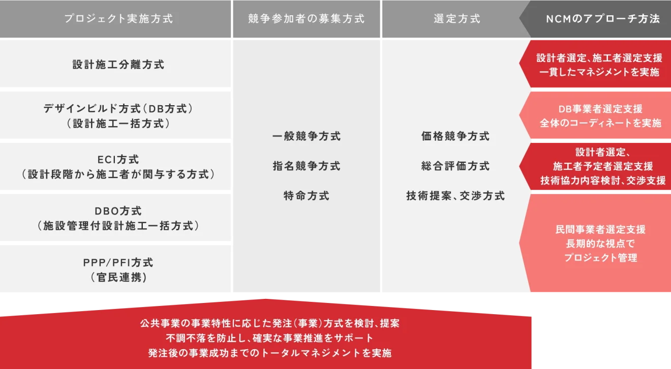 NCMは、国⼟交通省によるモデル事業を3年間実施し、多様な⼊札契約⽅式モデル事業を実践してきました。これまでに、多数の発注⽅式※1と選定⽅式※2の⽀援を⾏い、その経験と実績に基づき、事業の特性に応じた発注(事業)⽅式を分析・提案します。事業の実施にあたっては各⽅式の留意点や勘所をおさえたアプローチにより、不調不落を防⽌し、確実な事業推進をサポートします。発注者・候補事業者双方にとって公平で透明性の高いプロセスを構築し、公共事業の信頼性向上に貢献します。