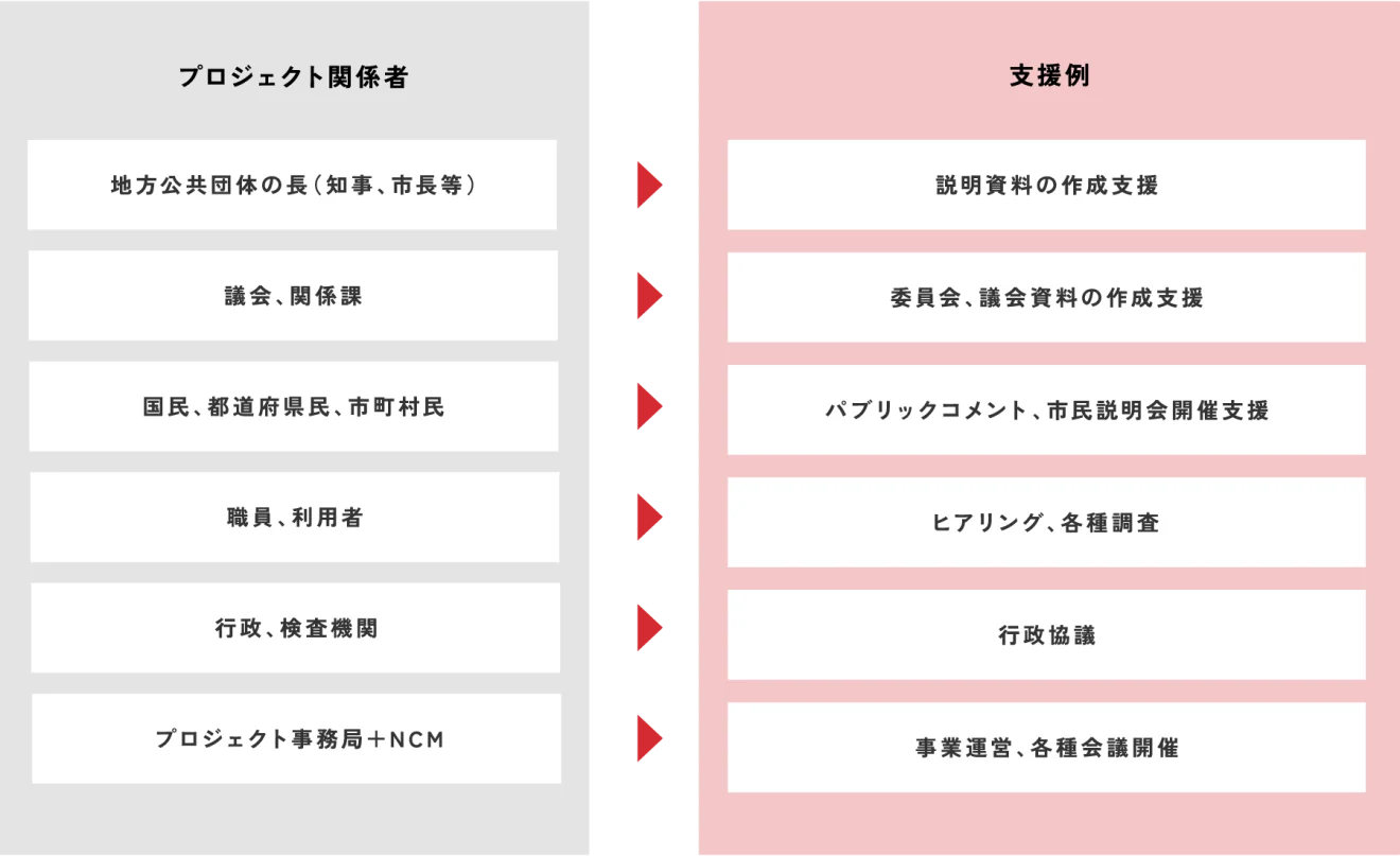 NCMは、事業⽴ち上げの基本構想や基本計画段階から、設計・施⼯・運用段階まで、全フェーズで発注者を⽀援します。発注者のニーズに応じた関連業務も数多く⼿掛けており、ワンストップで発注者のあらゆる要望におこたえします。