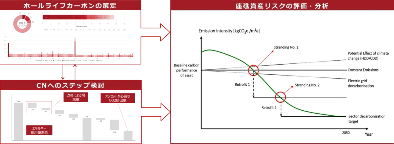 建築分野における脱炭素化の進展に伴い、環境規制や市場変化により、資産が価値を失う「座礁資産リスク」は年々高まっています。NCMは、保有・運用資産のカーボン関連リスクを可視化し、評価・分析を通じて企業への影響を定量化します。そのうえで、リスク最小化に向けた移行計画や具体的な対策の立案・実行を支援し、資産価値の維持・向上につなげます。