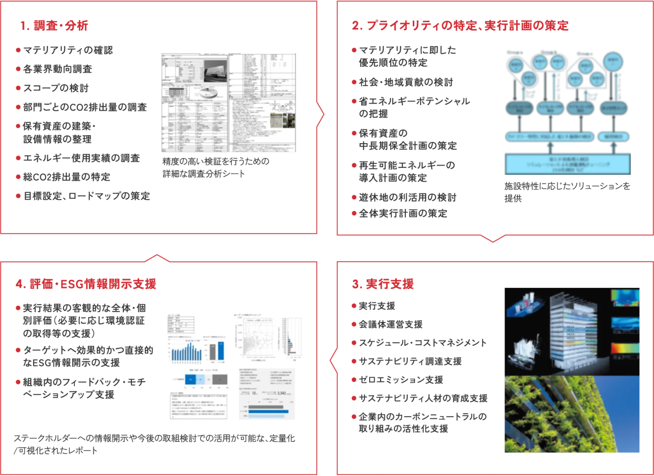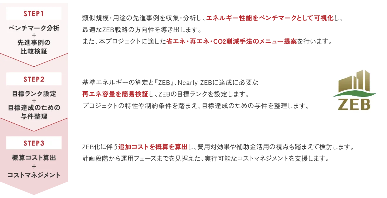 また、グリーンエネルギーの購入に頼らず、建物の環境性能を向上と「電気、ガス、その他エネルギー」のベストバランスを施設特性に応じて検証し、本質的なカーボンニュートラルの実現を目指します。