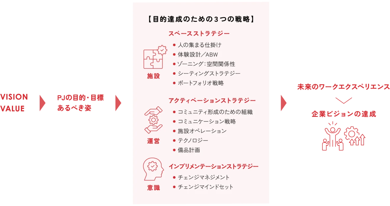 新しいワークスタイルを実現するためには、施設だけではなく、運営と意識を加えた3つの戦略を統合することが不可欠です。