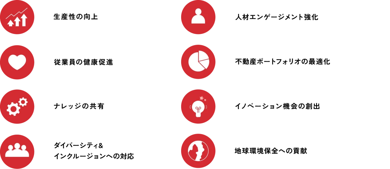 新型コロナウイルス感染症(COVID-19)を契機に、世界中で未来の働き方が模索されてきましたが、現在もなお、ハイブリッドワークのあり方やオフィス回帰の是非等、働き方の探求は続いています。国内においてもワークスタイルの変革は重要な経営課題となり、社員の能力を最大限活かすための投資としての側面が色濃くなってきました。加えて、オフィスの目的は、従業員に働く場所を提供するだけでなく、企業のビジョンや価値観を社内・社外に向けて発信する媒体としての目的を持つようになってきています。