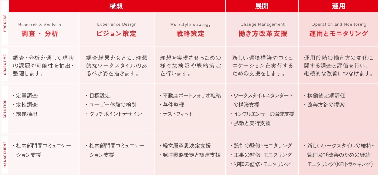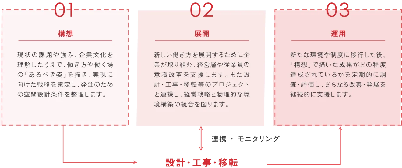 オフィスの移転や改修は、組織のワークスタイルを目指す姿へと進化させる最大のチャンスです。私たちはお客様とともにその機会を活かし、変革の実現につなげます。