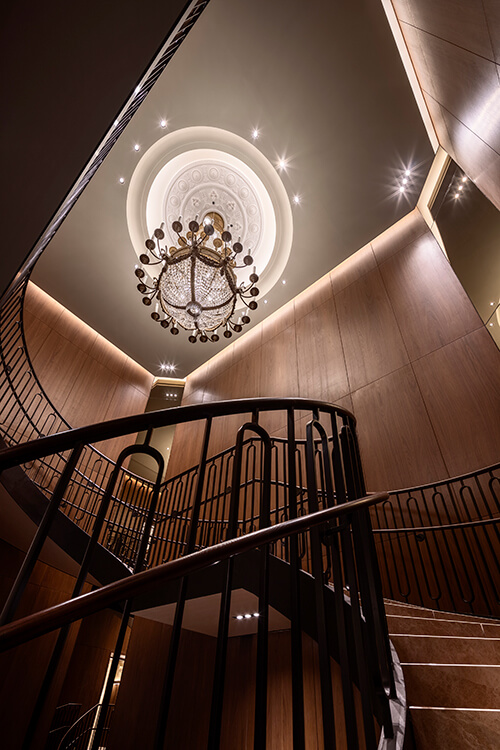 そうですね。大シャンデリアはなかなか設置場所が決まりませんでしたが、色々な角度から見ることが出来るので、らせん階段を計画した時からここしかないとデザイナーと提案させていただきました。また今回の工事では、一品一品を手仕事で行う工事が多かったですね。山本支配人には、立ち会っていただいたモザイク壁画や大シャンデリアの検査など、一つ一つのパーツや部品を職人さんが組み上げていく過程を見ていただきましたし、さらにそれらの耐震性なども考慮して納まりを検討していきました。