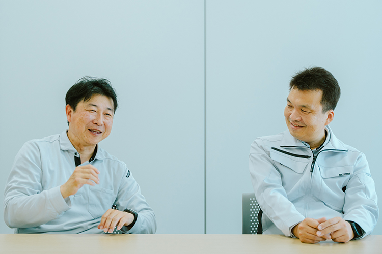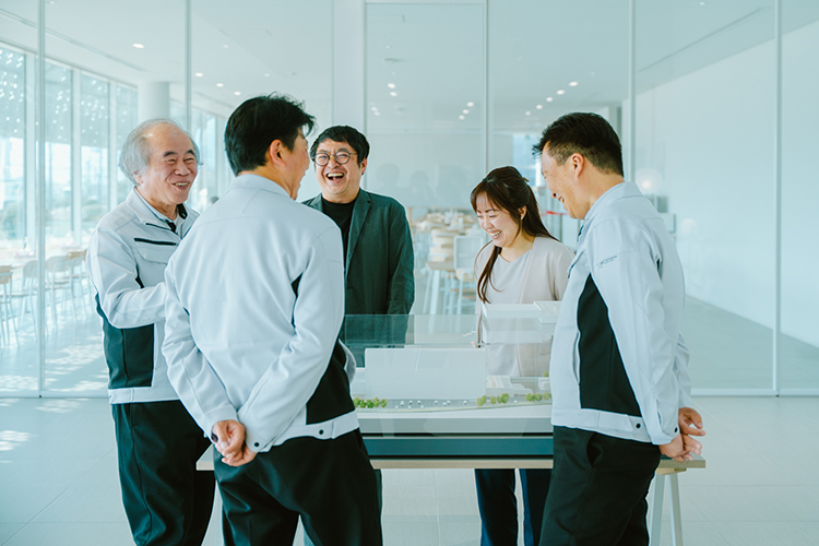 私は車で通勤するときに、正門からスロープを上がって、建物の前を過ぎて駐車場へ行く動線が好きですね。「ああいいところで働いているなあ」なんて思いながら入っていく感じがあります。プロジェクトの立ち上がりから、工場機能の完全移転まで5~6年がかり。サラリーマン人生でこのような経験はなかなかできないことで、やっぱりうれしいですよね。建物の中でも、「ここのこの部分は自分がこだわって提案したところだ!」というのがあって、いつまでも思い入れを感じたり(笑)。よく家を新築すると次を建てたくなるなんて言いますけれど、新工場が完成したあとに、山口と、「もう一回やれたなら…」なんて話をしました。